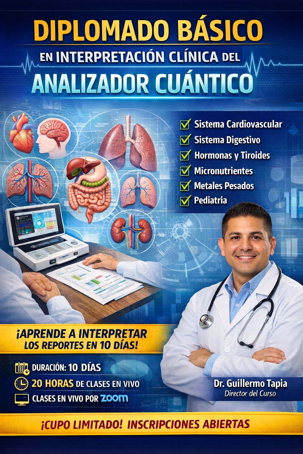 Capacitar al profesional en la correcta interpretación del reporte del analizador cuántico, integrando parámetros fisiológicos, metabólicos y bioquímicos en un enfoque clínico básico.